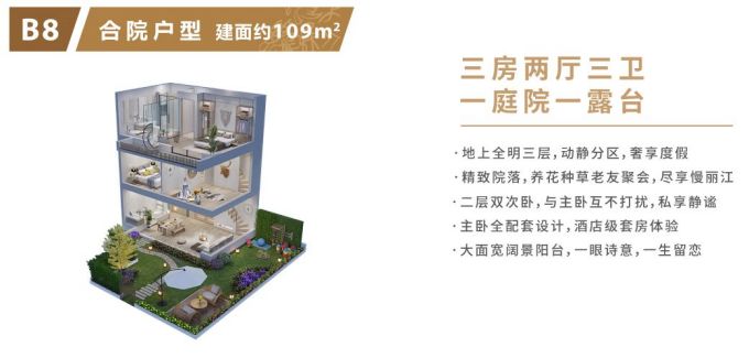 一期叠院以庭院小面积为主打,全采光户型,随时随地感受阳光和清风;庭院连通客厅,美景如影随形。整体强调旅居度假感,适合投资、自住,为丽江假日增加精致品位。