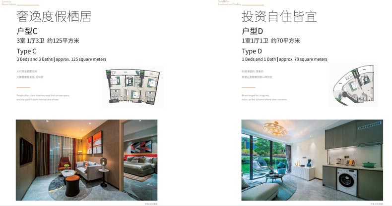 在售产品1-2号楼主力户型约70-125㎡,户户配备超宽景观阳台,奢适享受演绎全新景观视觉,全屋按照高端酒店配套进行装修,提供精装交付达拎包入住标准。
