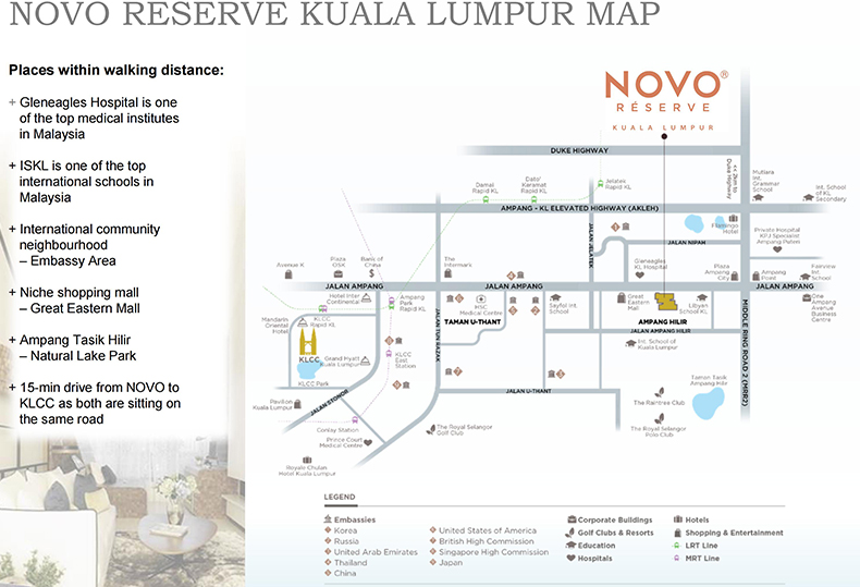 吉隆坡天耀臻选(NOVO Reserve),位于安邦大使馆区,项目为现房。天耀臻选是吉隆坡目前最热门的高端服务式住宅,距离双子塔仅3公里,吉隆坡时尚中心武吉免登6公里。曾获最佳公寓建筑设计奖的天耀臻选,每个单位附带精致的家居装潢和高雅时尚的设计,并且给你五星级酒店的服务与设备,为吉隆坡的奢华公寓水平带来了全新的诠释。