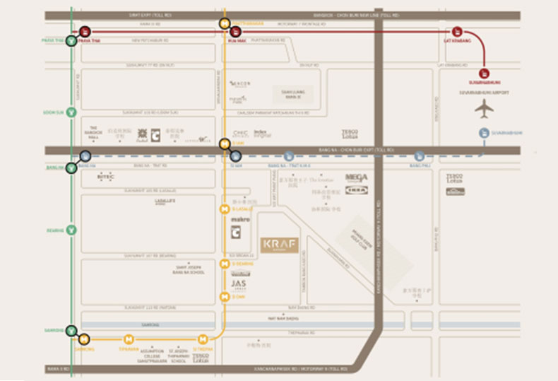 5公里内:4大商场,Mega Bangna、宜家商城、Central Plaza和The Bangkok Mall;7个连锁商超Big C、莲花超市等;7所国际学校,4所高水准医院。
